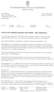 Brev fra Fylkesmannen i Oslo og Akershus angående avslag på søknad om fri rettshjelp. (In Norwegian).